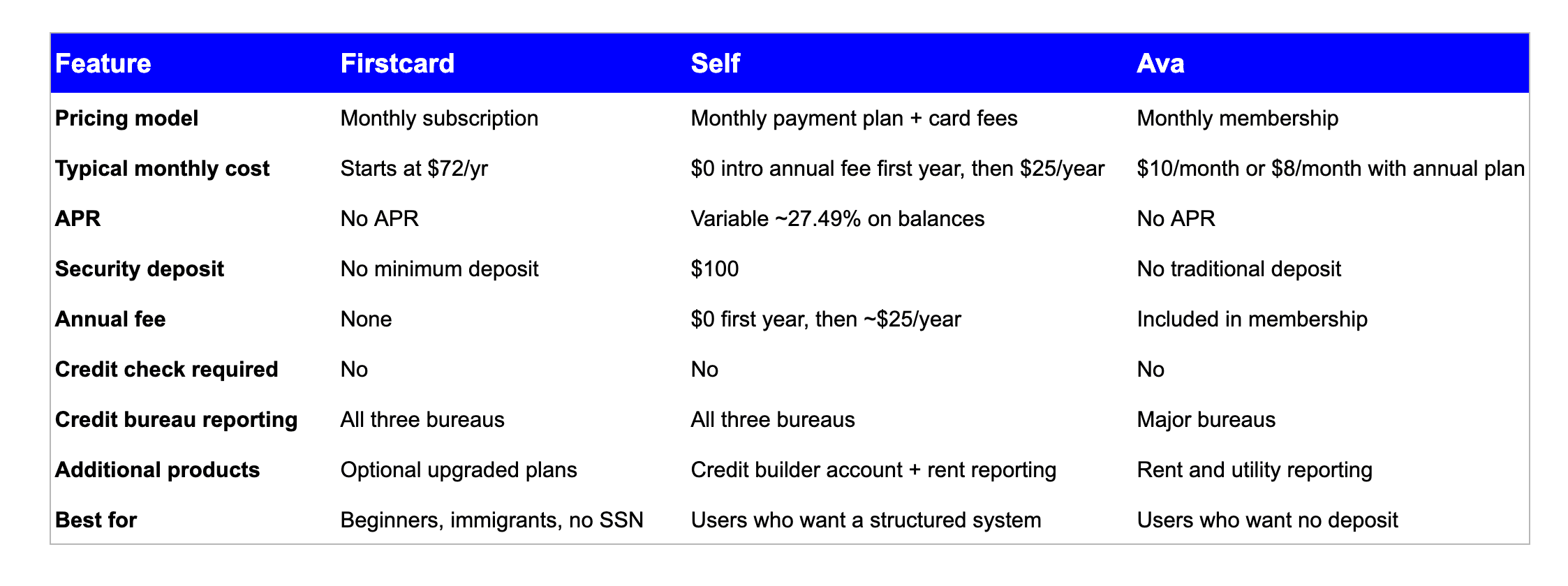 The best credit builder card for no credit history is one that does not require a credit check, does not require existing credit, and reports activity to all three major credit bureaus. Cards like Firstcard, Self, and Ava are strong options because they approve users with no credit history and focus specifically on building positive payment history. The best credit builder card for beginners also offers transparent fees, clear credit reporting, and an easy path to start without relying on traditional credit qualifications.